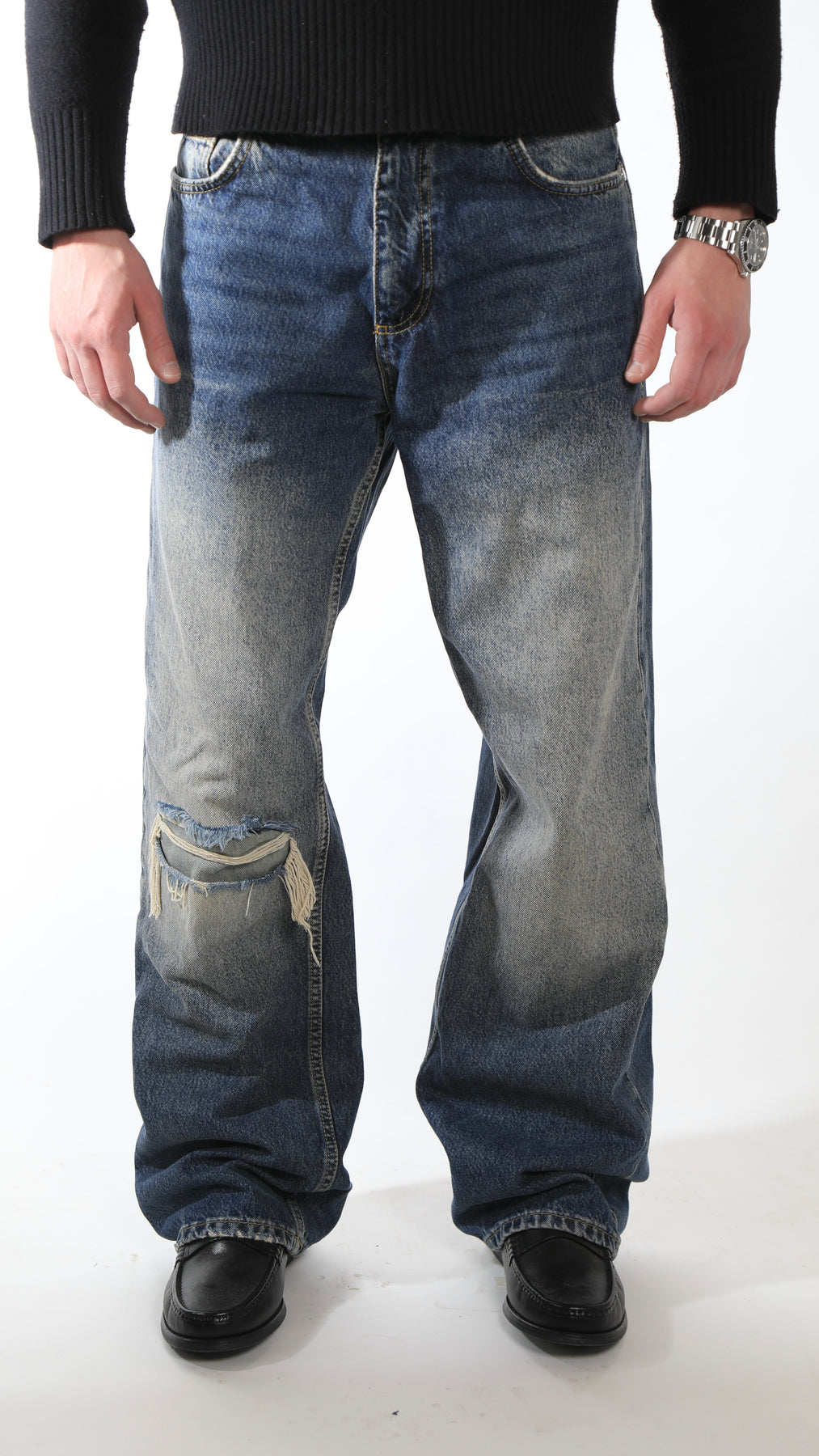 Denim blu con lavaggio sfumato effetto vintage e rottura strutturata sul ginocchio.