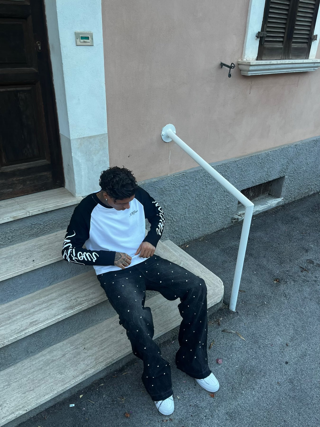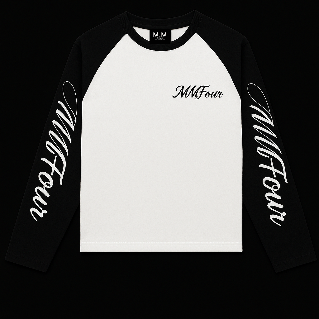 Le maniche nere a contrasto e il logo MMFour ricamato sul petto e lungo le braccia definiscono un’estetica iconica, ispirata alle collezioni street di fascia alta.